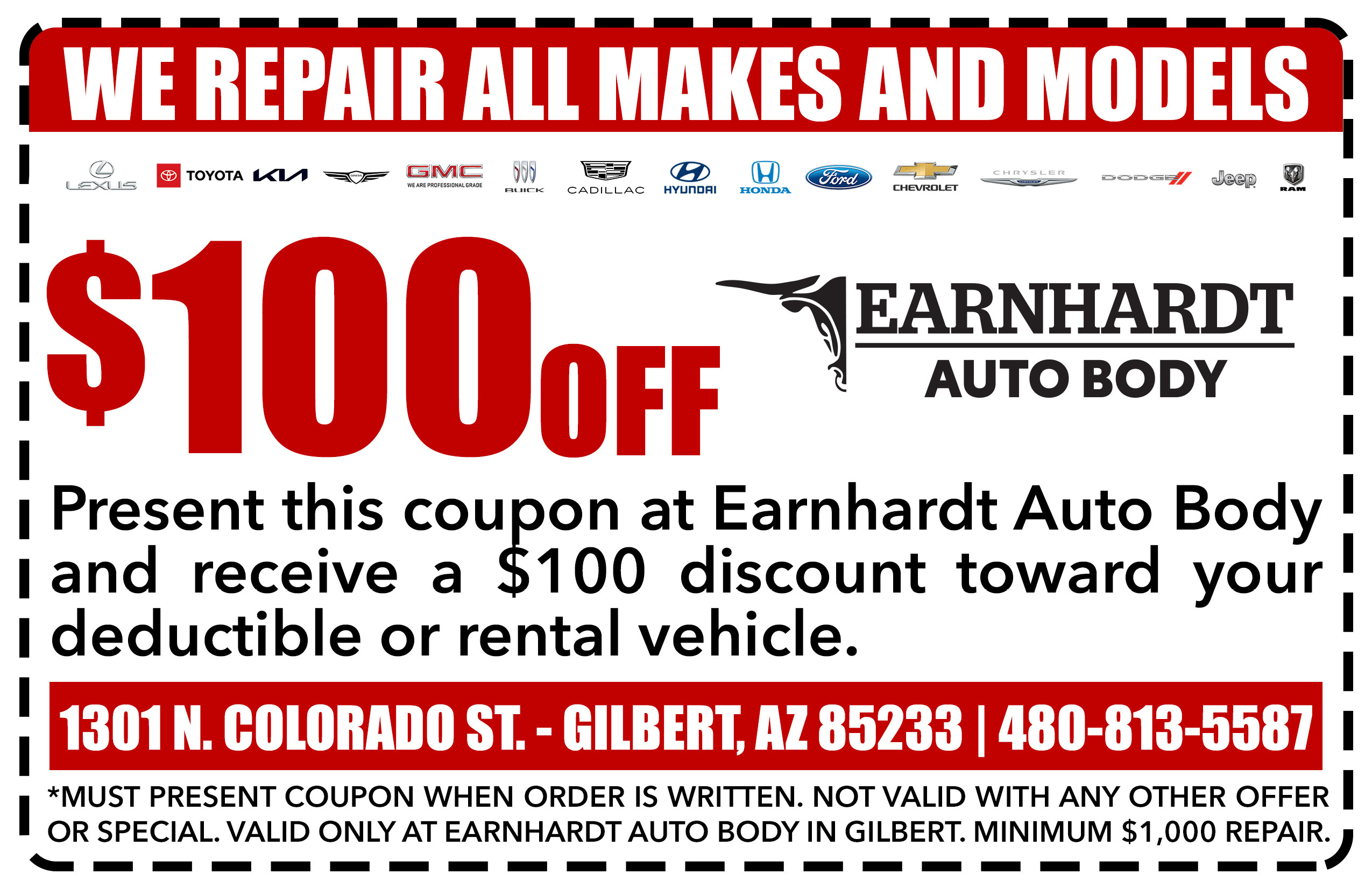 Welcome to Earnhardt Auto Body, located South of Baseline Rd., off of Arizona Ave., behind Costco in Gilbert, AZ. We specialize in auto body repair, professional automotive paint application, and collision restoration. Servicing all makes and models, our work is backed by a Lifetime Limited Warranty against defective workmanship, for as long as you own your vehicle.